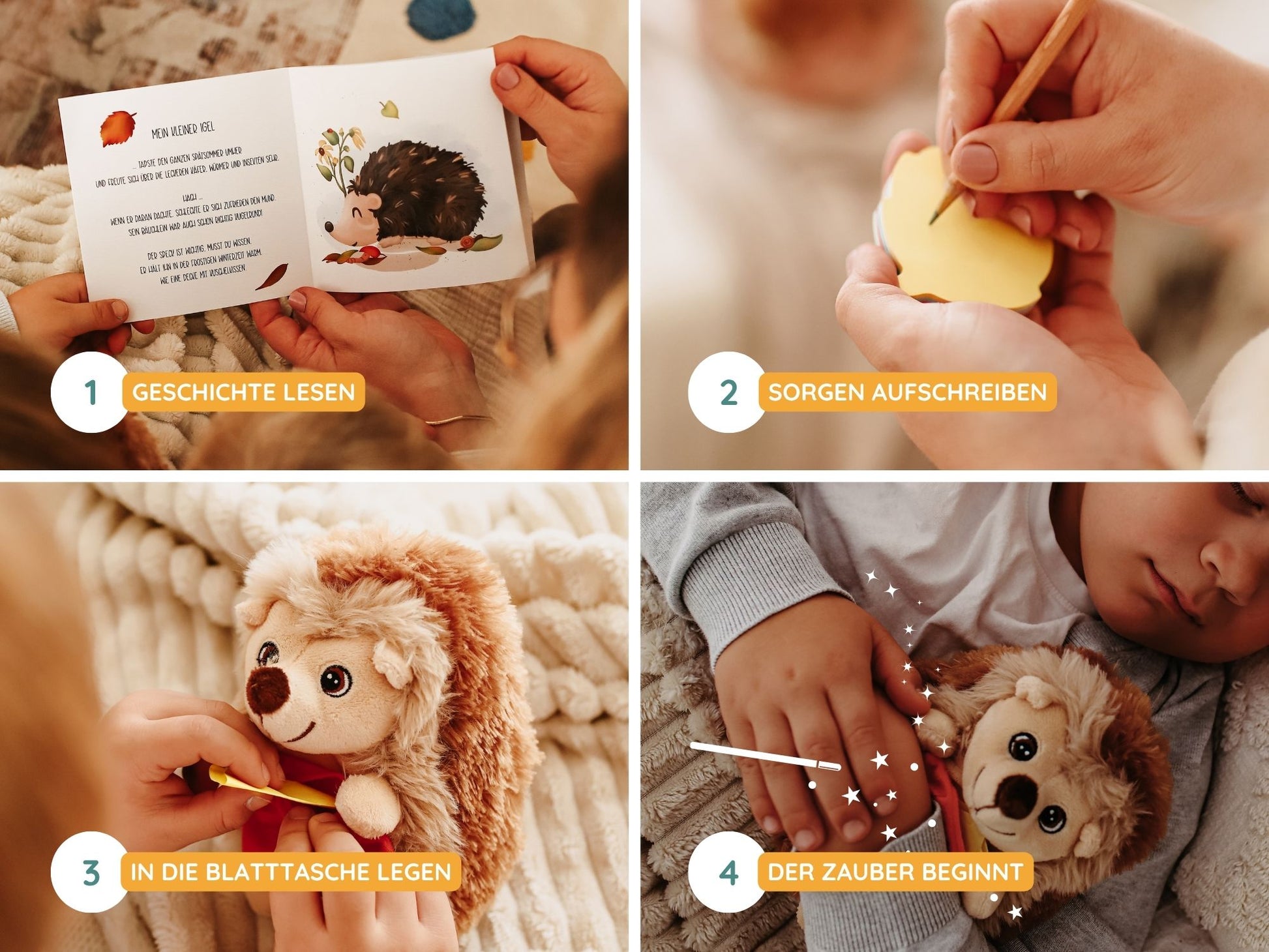 - Mini-Buch „Mein kleiner Igel“ – erzählt und visualisiert die Geschichte mit handgemalten Motiven rund um die Affirmationskarte und verstärkt das Verständnis deines Kindes und den Sinn hinter dem Plüsch-Igel und seiner Blättertasche