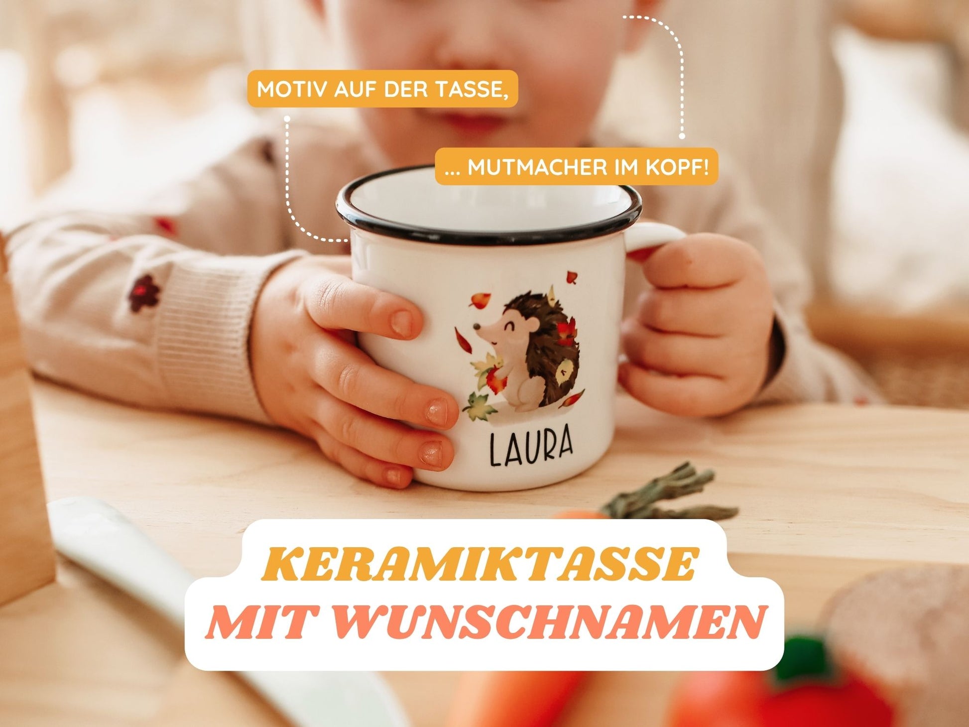 - personalisierte Keramik Tasse im Emaille Look mit Igel Motiv - so erinnert diese einen schon am Frühstückstisch, dass man sich nicht sticheln lassen soll!