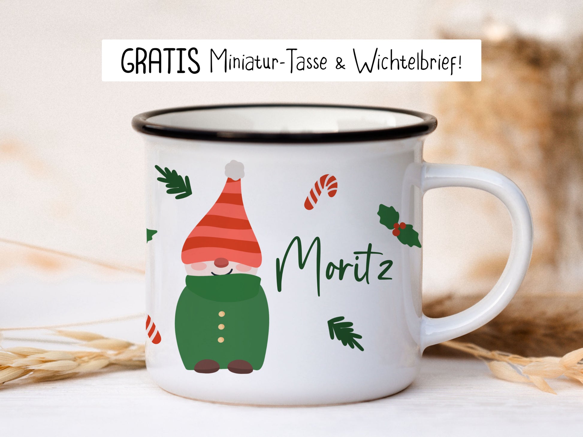 Entdecke meine frohlockende Keramik Tasse im Emaille-Look mit niedlichem Wichtel-Motiv - ein wirklich zauberhaftes Geschenk für dein Kind in der Wichtelzeit! Diese von Herzen gestaltete Tasse ist ein großartiger Begleiter beim Adventsfrühstück, im Weihnachtsurlaub oder in der gesamten muckeligen Vorweihnachtszeit.