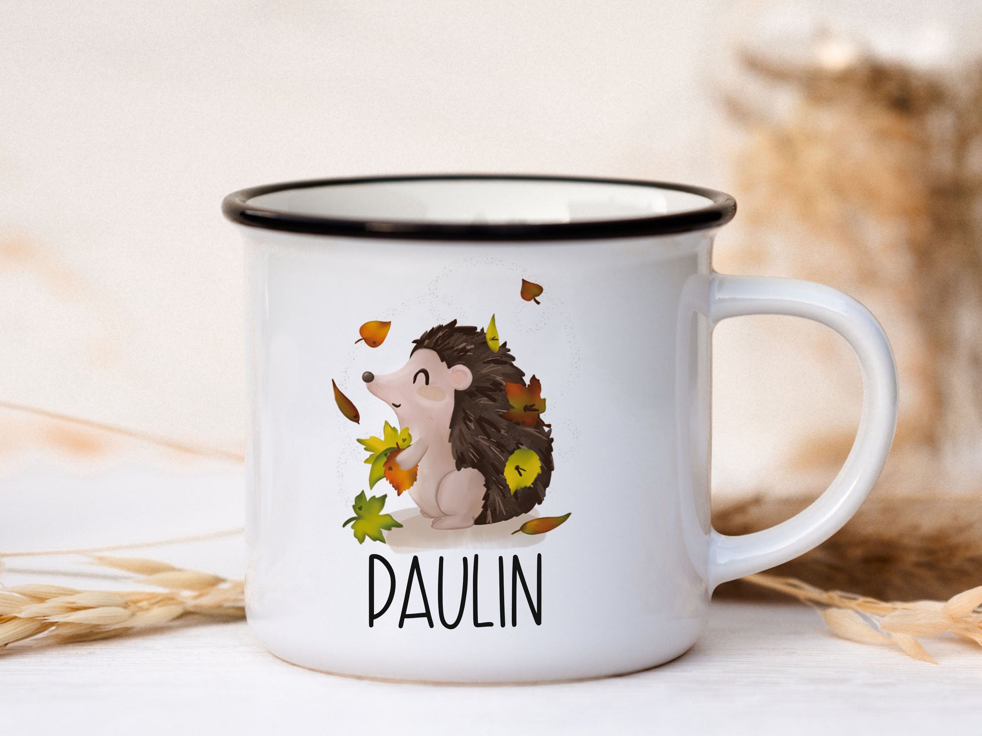 - personalisierte Keramik Tasse im Emaille Look mit Igel Motiv - so erinnert diese einen schon am Frühstückstisch, dass man sich nicht sticheln lassen soll