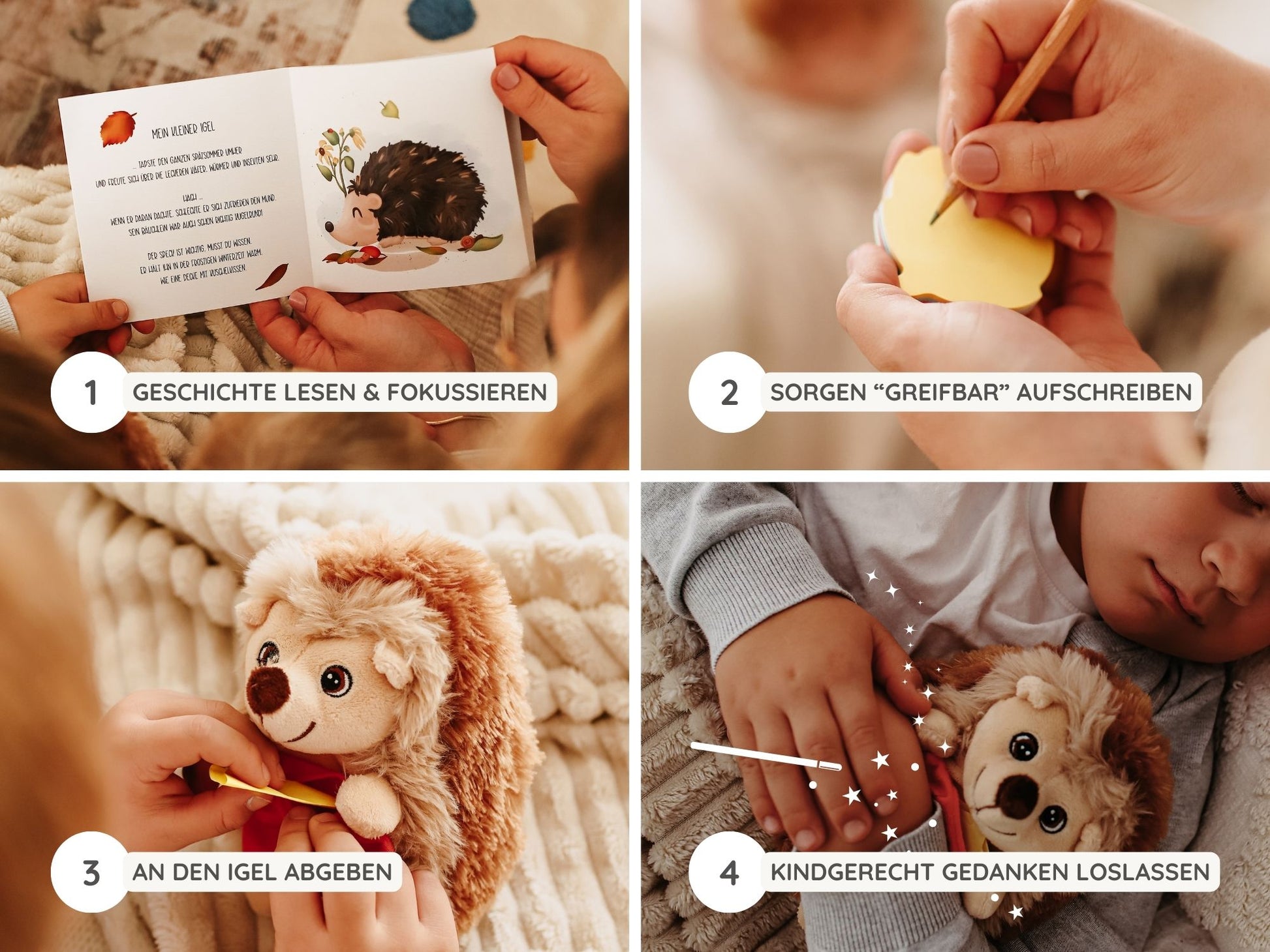 - Igel-Set - ein super kuscheliger Sorgenfresser Igel – der perfekte Begleiter deines Kindes, der alle Sorgen greifbar macht und vertreibt. In seiner kleinen Blättertasche ist genug Platz, um alle Sorgen verschwinden zu lassen und danach ausgiebig zu schmusen.